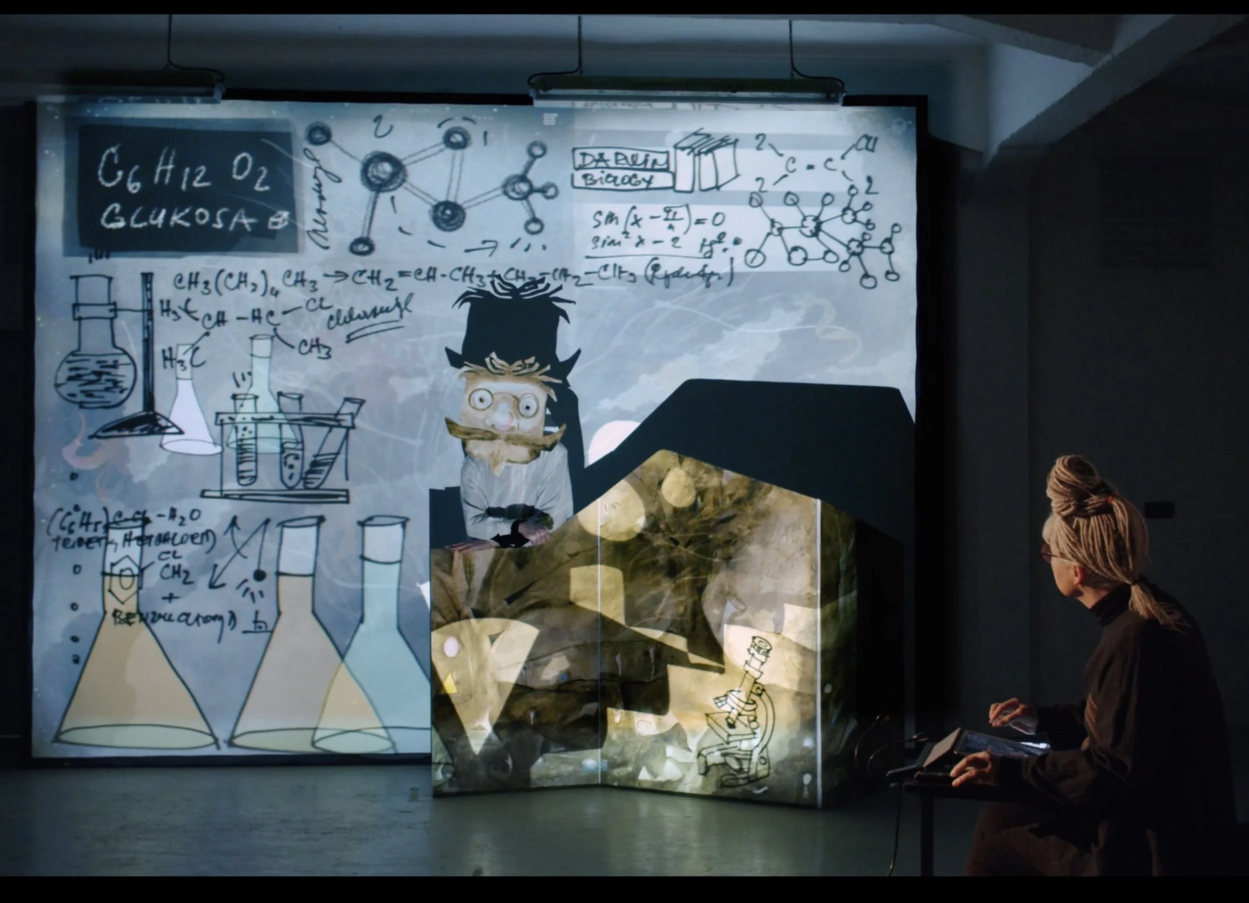 The live drawing is transmitted via a projector onto the stage. But the light of the projector is not only light, but also a message, a part of the scenography, a source of mood. But it primarily conveys a work of art, which is also still in motion. It works with an actor, but also with a puppet or another object and still casts a shadow.