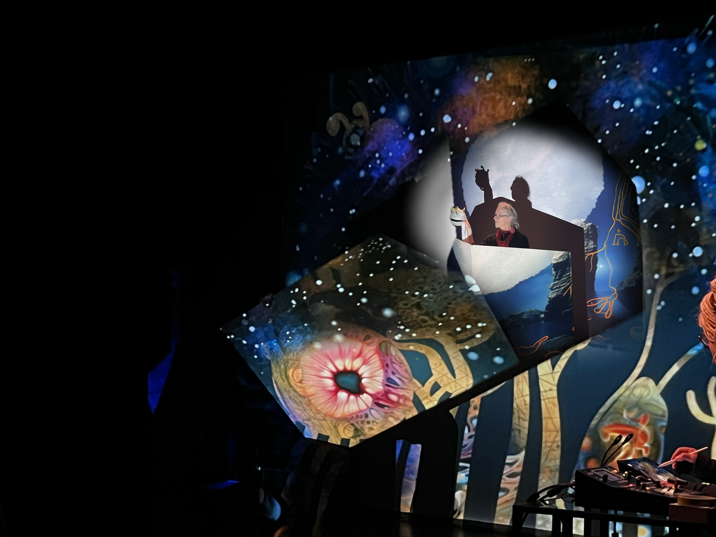Velké a malé světy s loutkami a předměty ve světle projekce, živou kresbou na iPadu a hercem a stínohrou